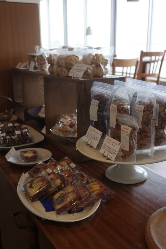 朝の時間帯はテイクアウトのみの営業です。お店には美味しそうな焼き菓子がずらりと並んでいます。少し立ち寄るだけのつもりが、プレゼント用の焼き菓子を購入し、ギフトラッピングまでしてもらいました。