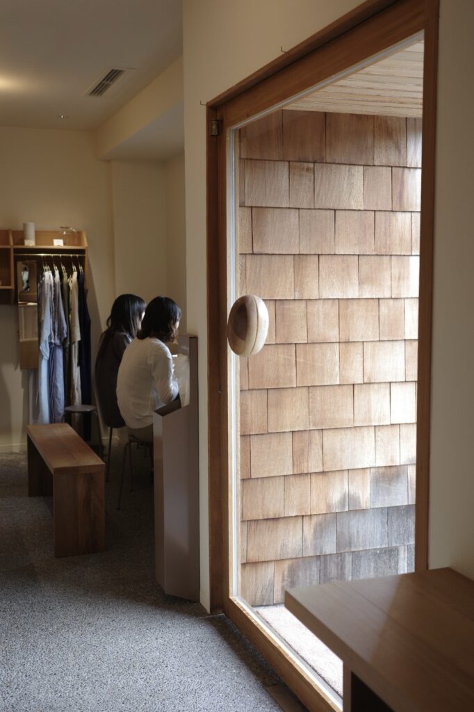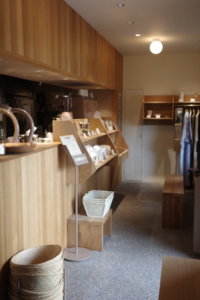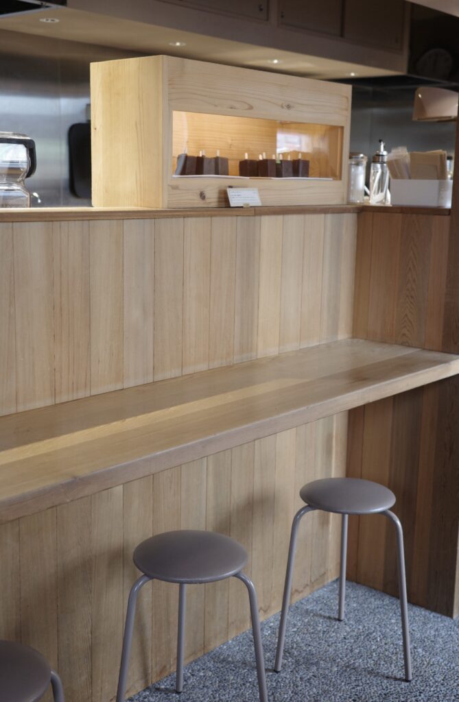 木を基調にした店内の床はグレー、脚の細いスツールがアクセントとなり、ほっこりせずにモダンな印象です。店内奥にはコーヒーグッズが置かれ、レジ周りにはチーロバのドリップバックやcoffee Kajitaのお豆やカフェラテベースを購入することができます。そんなに広くはない空間ですが、必要なところに必要なだけ、モノが美しく並んでいて、キュンとときめきます。